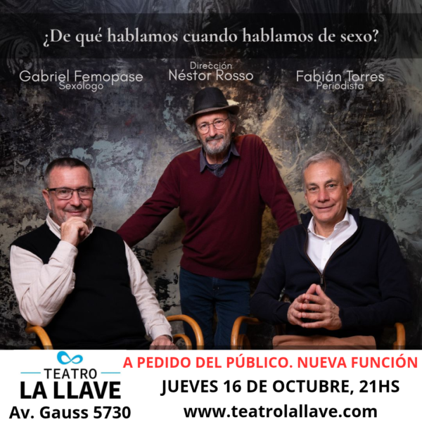 El reconocido sexólogo Gabriel Femopase, junto al periodista Fabián Torres, en un espectáculo diferente. Un diálogo que te dejará pensando. Un antes y un después de lo que creías saber sobre el sexo, la sexualidad y el amor desde una perspectiva diferente. Dos amigos reunidos en un diálogo imperdible para repensar el erotismo.